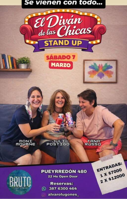 El diván de las chicas Compartí esta obra: sábado 7 de marzo • 22:00 hs Bruto Bar Pueyrredón 480 Salta Llamar al 0387 4516483 Llamar al 0387 4516483 Llamar al 0387 4516483 Llamar al 0387 4516483 Llamar al 0387 4516483 Compartí esta obra: Género: Stand Up Público: Jóvenes y Adultos Entradas: Entrada 1x$7.000 2x$12.000 En venta en boletería del espacio Disponibles en Whatsapp 5493876300464 Comprar online* *Pueden aplicarse comisiones Ficha Técnica En escena: Moni Movane, Juli Postigo y Tana Russo